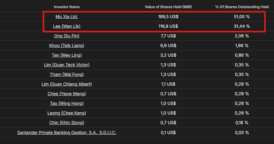 Hay inversores de referencia y skin in the game. Para mi gusto, la participación es demasiado alta, ya que si las cosas se complican y el mercado presiona la acción, la familia Wan podría aprovechar para pescar en aguas revueltas y sacar la compañía de cotización. A mi personalmente no es la primera vez que me «roban».